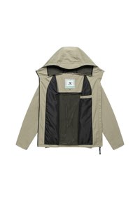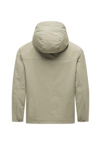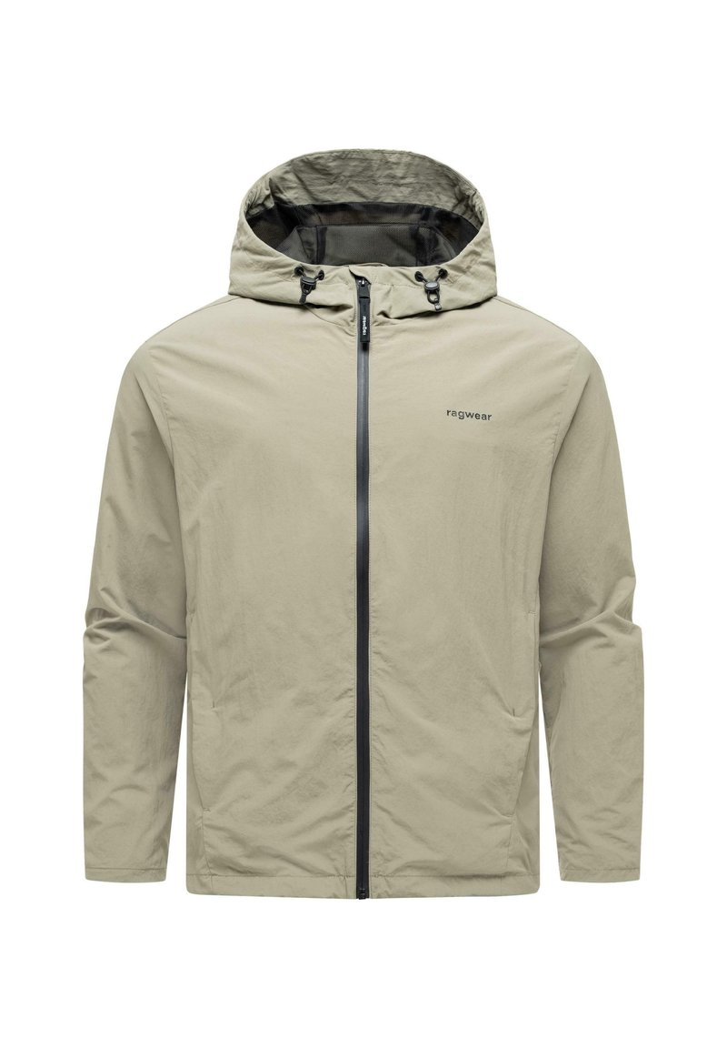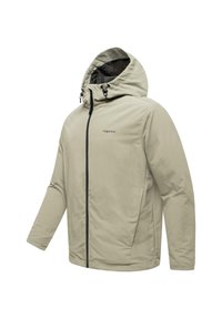 Jasno beżowa kurtka z kapturem na pełnym zapięciu na zamek, z regulowanymi sznurkami przy kapturze i małym logo "ragwear" na piersi.