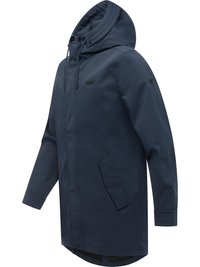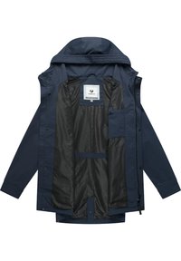 Granatowa kurtka przeciwdeszczowa z kapturem, zapinana z przodu na zamek błyskawiczny i zatrzaski, z regulowanym sznurkiem, długimi rękawami oraz dwoma skośnymi kieszeniami bocznymi.