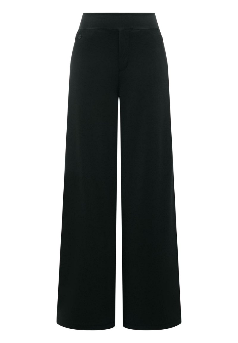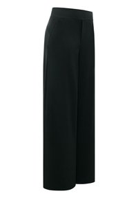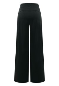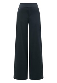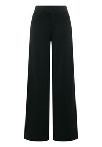 Czarne, szerokie spodnie z wysokim stanem, z ukrytym zapięciem z przodu i minimalistycznymi detalami.