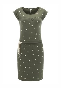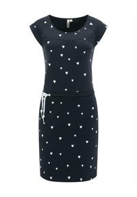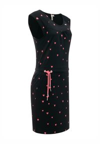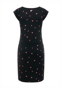 Czarna sukienka z krótkim rękawem, z różowym wzorem w serca, okrągłym dekoltem i różowym wiązaniem w talii po lewej stronie.