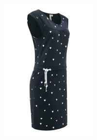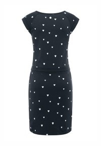 Granatowa sukienka w białe wzory serc, z krótkimi rękawami, okrągłym dekoltem i białym sznurkiem w talii.
