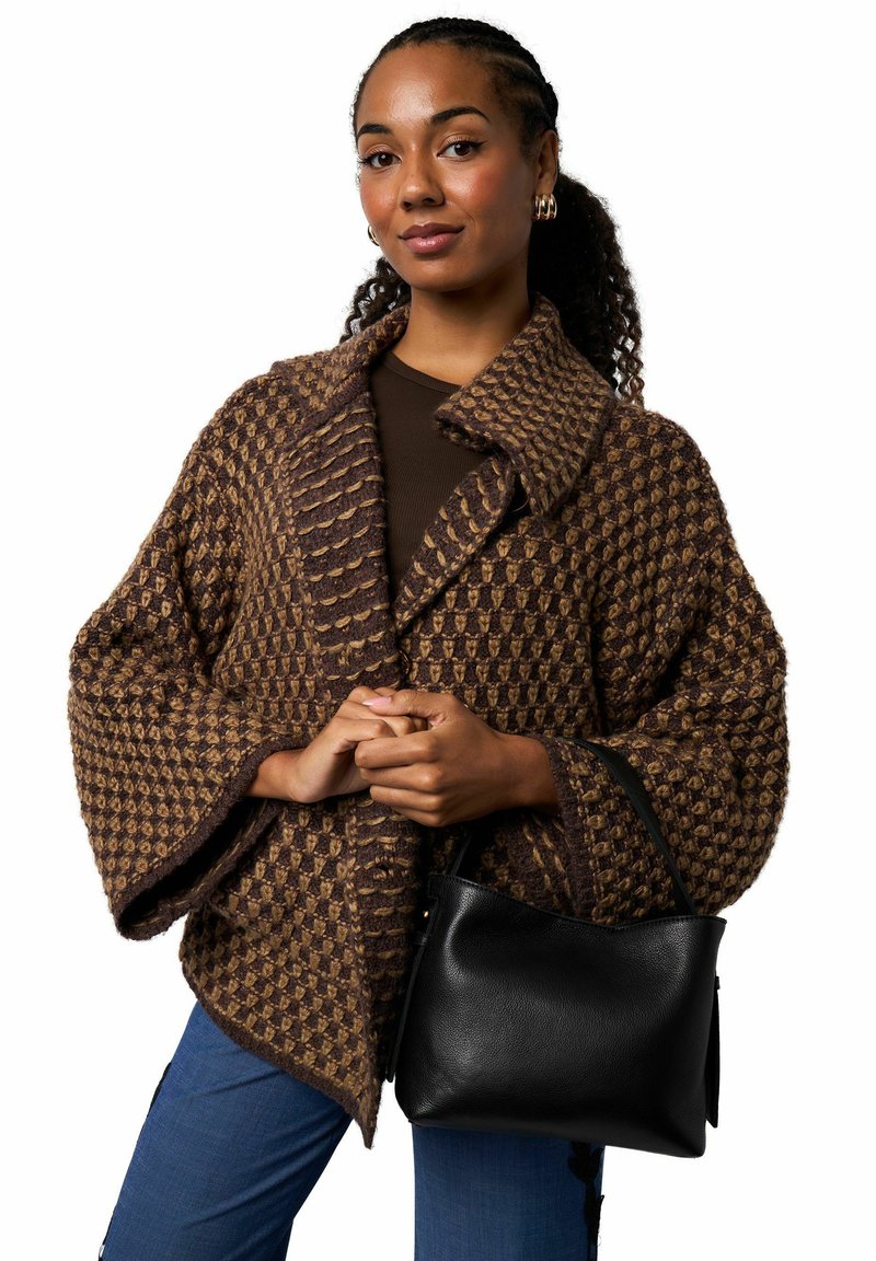 Brązowy dziergany kardigan z teksturowanym wzorem, oversize'owym kołnierzem i szerokimi rękawami. Połączony z czarną skórzaną torebką.
