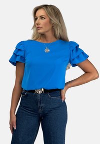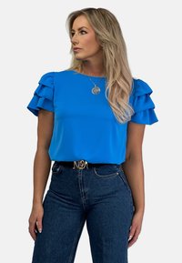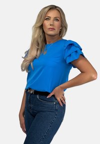 Niebieska bluzka z krótkim rękawem z warstwowymi falbanami; gładka tekstura. Połączona z dżinsami o wysokim stanie i czarnym paskiem z metalowym logo.