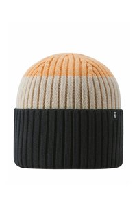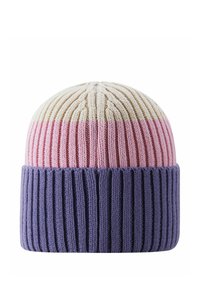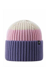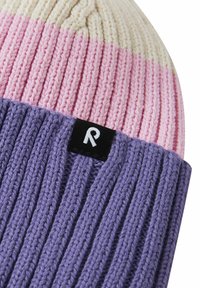 Dziana prążkowana czapka z trzema kolorowymi blokami: kremowym wierzchem, różowym środkiem oraz złożonym fioletowym brzegiem z małą czarną metką.