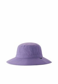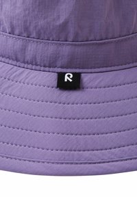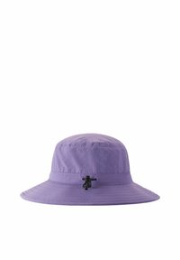 Lawendowy kapelusz typu bucket z szerokim rondem, ozdobiony przeszyciami wokół korony i ronda, przedstawiony na białym tle.