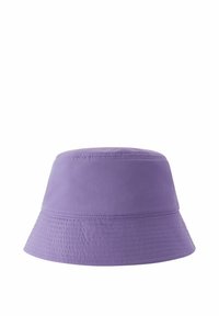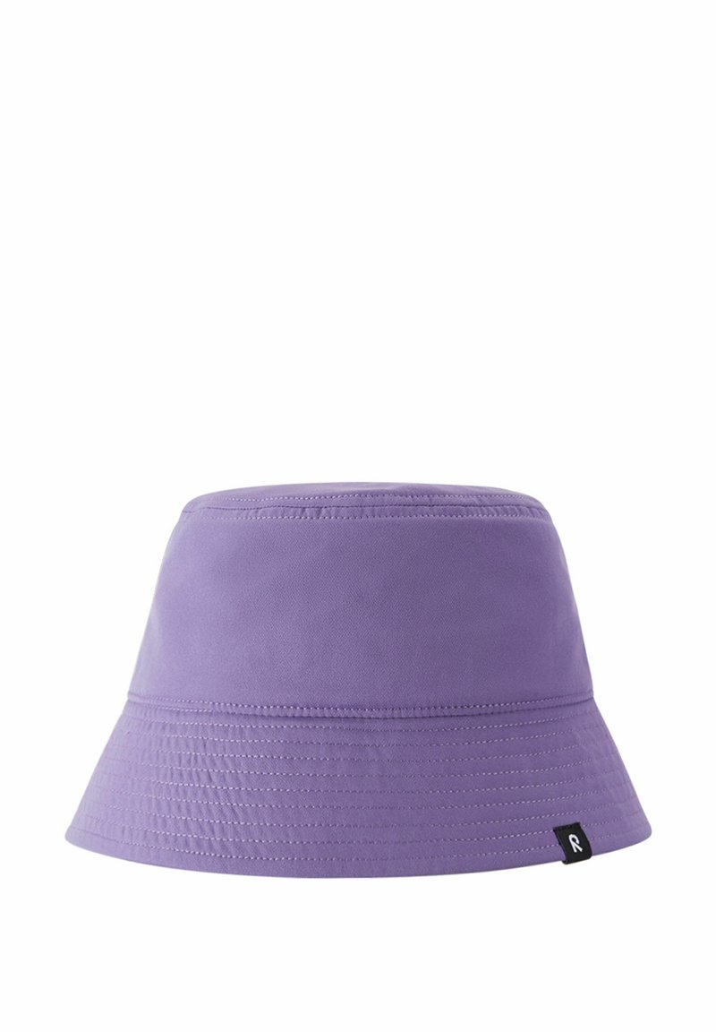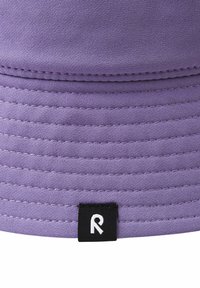 Lawendowy kapelusz z szerokim rondem z przeszyciami i małą czarną metką z tkaniny z białym stylizowanym logo "R" na białym tle.