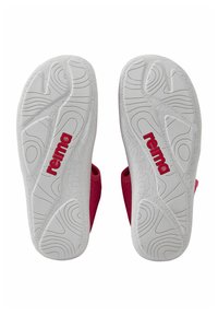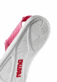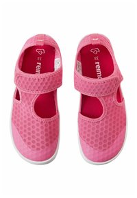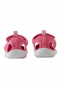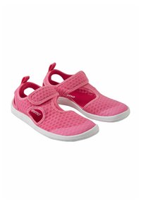 Różowy przewiewny but wodny z regulowanym paskiem na rzep, wycięciami po bokach, białą teksturowaną podeszwą i pętelką z tyłu buta.