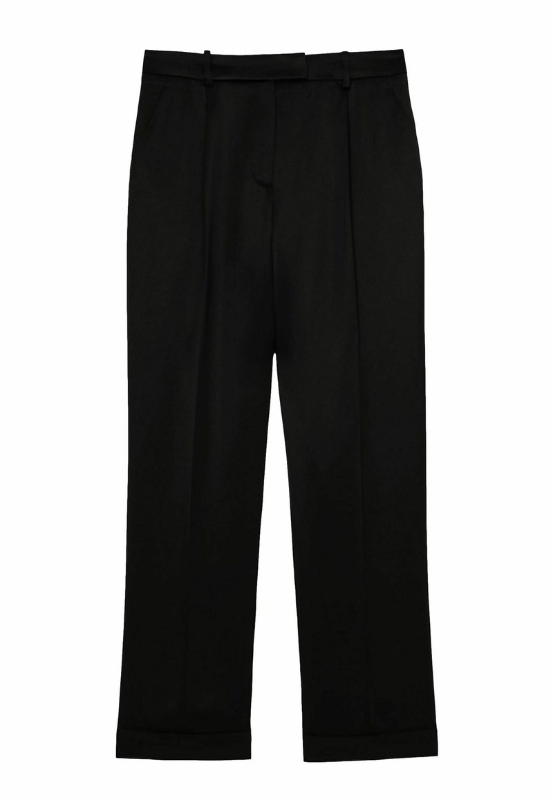 Czarne spodnie wykonane z gładkiego materiału, z plisowanym przodem, dwoma bocznymi kieszeniami i mankietami na nogawkach. Klasyczny krój o prostym fasonie.