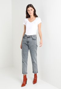 Biała koszulka z dekoltem w serek, wyblakłe szare dżinsy z wysokim stanem oraz czerwone botki za kostkę. Gładki materiał, luźny krój, podwinięte mankiety w dżinsach.