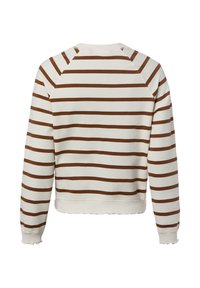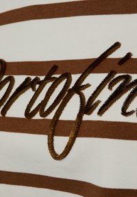 Biała bluza z brązowymi poziomymi paskami i haftowanym na piersi napisem „Portofino” pisanym kursywą, z prążkowanymi mankietami i dolną częścią zakończoną delikatną falbanką.