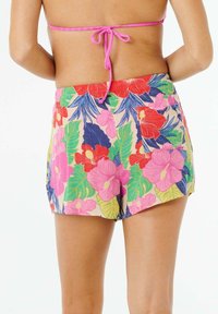 Szorty w kwiatowy wzór w żywych odcieniach różu, czerwieni i zieleni. Wykonane z lekkiego materiału, z elastycznym pasem i sznurkiem do regulacji.