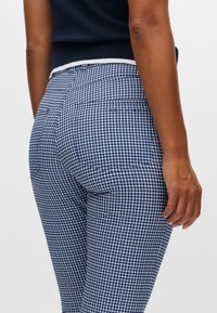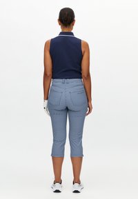 Granatowy bezrękawnik polo z białym kołnierzykiem, krótka spodnie w niebiesko-białą kratkę w stylu gingham, biała rękawiczka golfowa i białe buty sportowe.