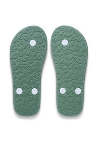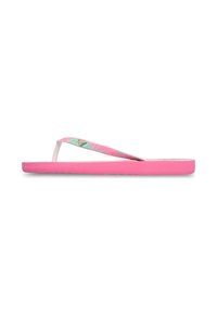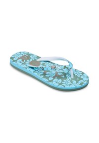 Niebieska japonka z kwiatowym wzorem na pasku, jasnoniebieską wkładką i ciemnozieloną podeszwą. Posiada teksturowaną wkładkę zapewniającą przyczepność.