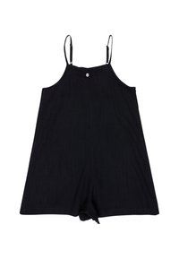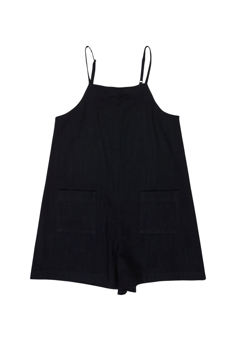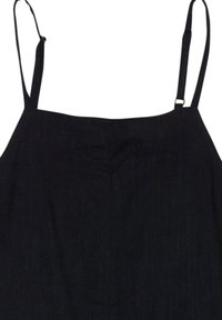 Czarny bezrękawnik z regulowanymi cienkimi ramiączkami i dwoma naszywanymi kieszeniami z przodu, rozłożony na płasko na białym tle.