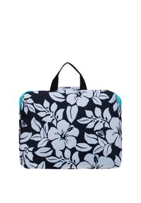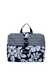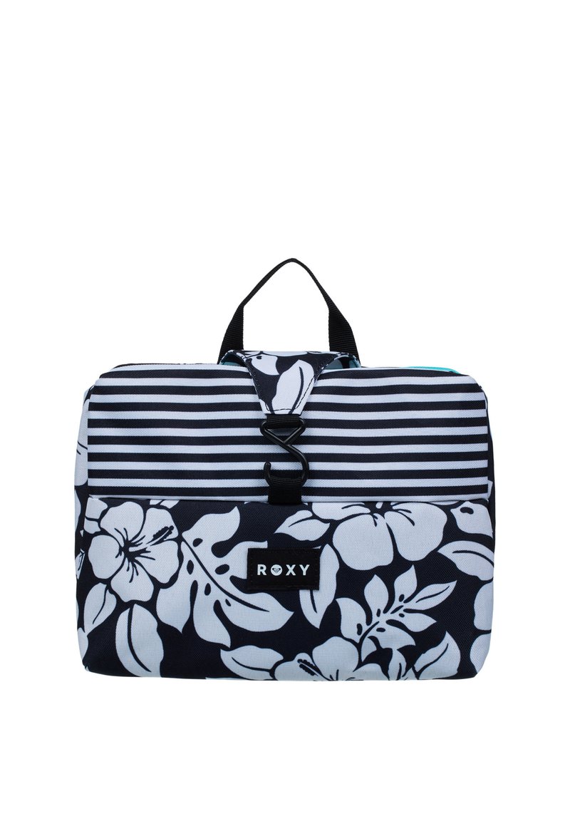 Prostokątna czarno-biała torba podróżna z kwiatowymi i paskowymi wzorami, uchwytem do noszenia, czarną klamrą oraz logo "ROXY" na przedniej kieszeni.