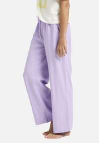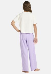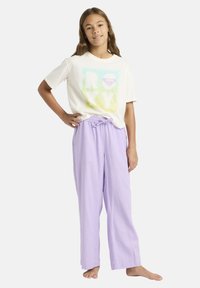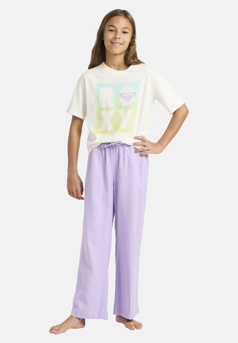 Dziewczyna stojąca boso, ubrana w białą koszulkę z pastelowym logo Roxy i luźne lawendowe spodnie, z ręką na biodrze na jednolitym tle.