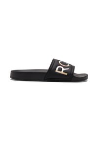 Czarne klapki z teksturowanym paskiem i błyszczącym złotym logo. Płaska podeszwa zapewniająca komfort, minimalistyczny i uniwersalny styl.