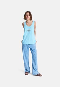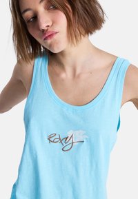 Młoda kobieta z krótkimi brązowymi włosami, ubrana w jasnoniebieski bezrękawnik z logo "Roxy" oraz jasnoniebieskie dżinsy, stojąca na jednolitym tle.