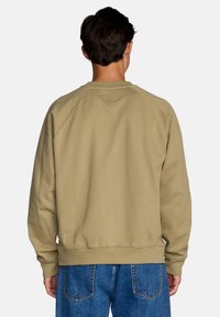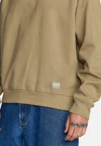 Beżowa bluza z okrągłym dekoltem i rękawami raglanowymi. Wykonana z mieszanki bawełny. Posiada małą naszywkę z logo na dole po lewej stronie.