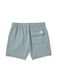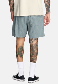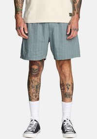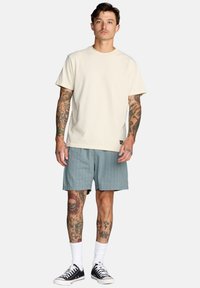Męskie jasnoniebieskie szorty w paski z miękkiego materiału o luźnym kroju. Zestawione z czarnymi trampkami i białymi skarpetkami do kostek.