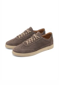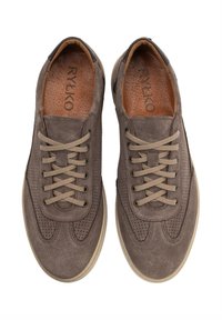 Brązowy zamszowy sneaker z perforowanym wzorem, z zapięciem na sznurowadła, beżową gumową podeszwą i brązowymi skórzanymi akcentami przy pięcie.