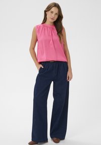 Kobieta z długimi brązowymi włosami, nosząca złote kolczyki koła, różową, jedwabistą, bezrękawnikową bluzkę i ciemnoniebieskie spodnie z wysokim stanem na jednolitym tle.
