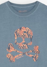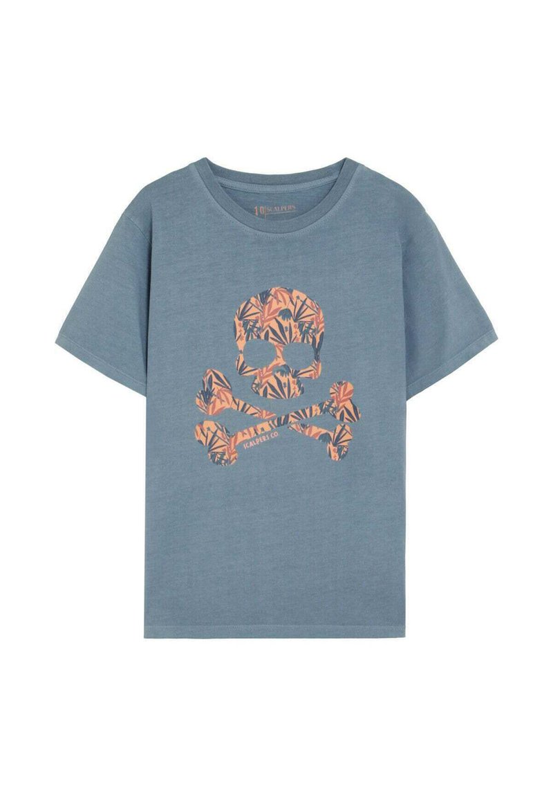 Niebieski T-shirt z krótkim rękawem z grafiką czaszki i piszczeli w pomarańczowo-ciemnoniebieski wzór kwiatowy na przodzie.