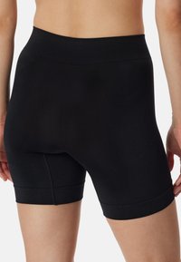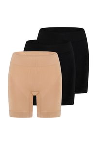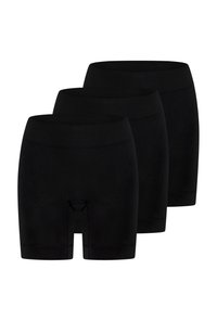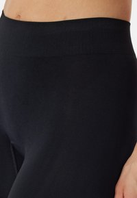 Uśmiechnięta kobieta w czarnym sportowym biustonoszu i dopasowanych szortach z wysokim stanem, pozująca z wyciągniętą ręką na białym tle.