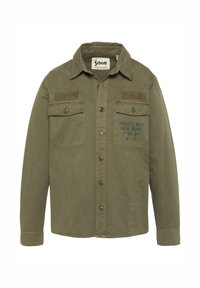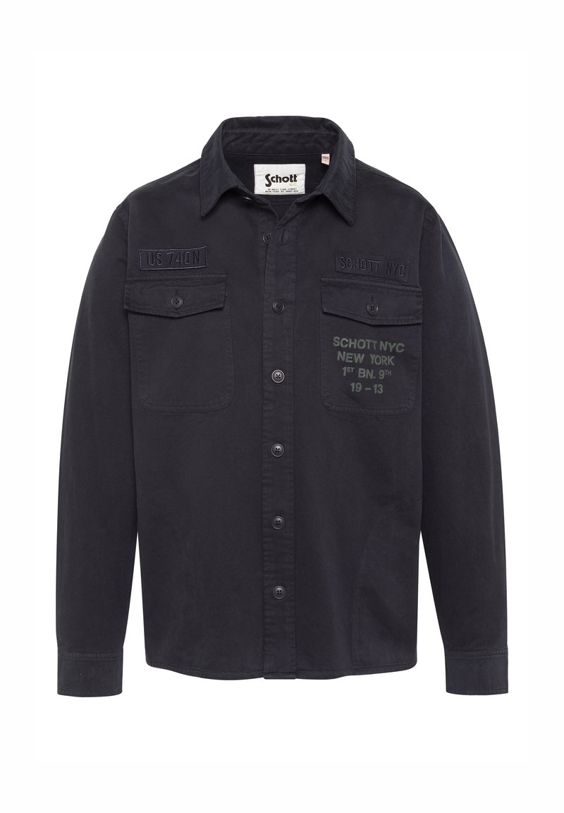Czarna koszula na długi rękaw na guziki z dwoma kieszeniami na piersi oraz nadrukowanymi napisami, w tym naszywkami "Schott NYC" i "US 740N".