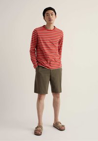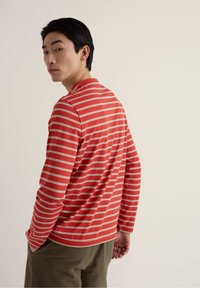 Młody mężczyzna z czarnymi włosami, ubrany w czerwoną i beżową koszulę w paski z długim rękawem oraz oliwkowozielone spodnie, z ręką na karku, patrzący w lewo.
