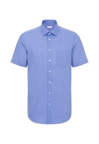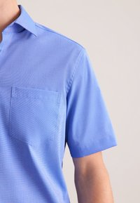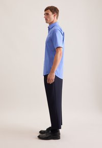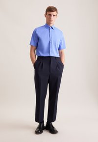 Mężczyzna ubrany w jasnoniebieską koszulę na krótki rękaw z kieszenią na piersi i ciemne spodnie z plisami, stojący na jednolitym tle.