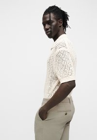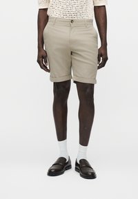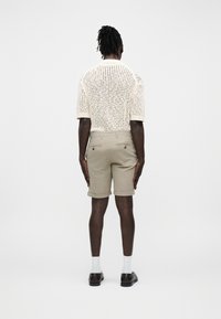 Mężczyzna w beżowych podwiniętych szortach, białych skarpetkach, ciemnobrązowych mokasynach i kremowym swetrze z dzianiny stoi na tle jednolitego tła.