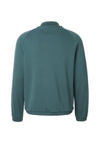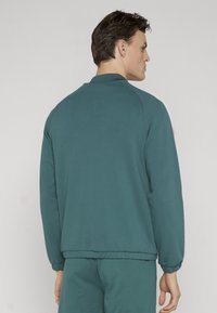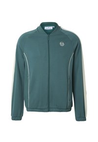 Młody mężczyzna ubrany w turkusową kurtkę sportową na zamek błyskawiczny i dopasowane spodnie z białymi paskami na rękawach, stoi na jednolitym tle.