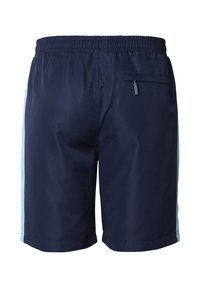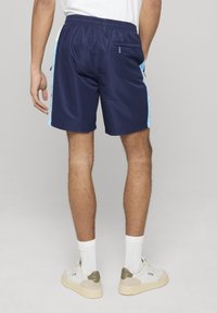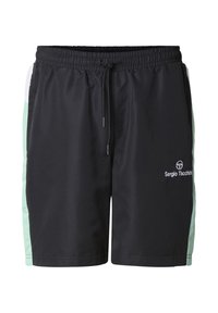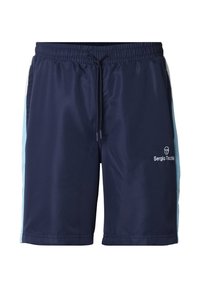Mężczyzna ubrany w granatowe szorty Sergio Tacchini, białe skarpetki, białe trampki i białą koszulkę, stojący z rękami w kieszeniach.