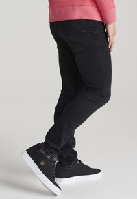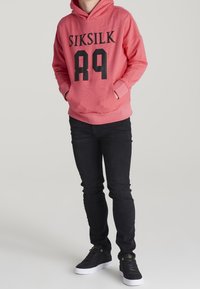 Osoba ubrana w czarne dopasowane dżinsy, czarno-białe sneakersy i różową bluzę, stojąca na jednolitym jasnym tle.