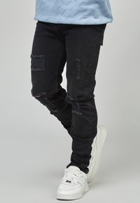 Czarne, dopasowane jeansy z efektem distressed, przetarciami i podartymi detalami, zestawione z białymi trampkami o teksturowanej powierzchni.