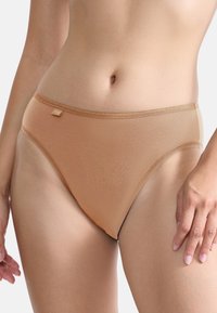 Beżowe majtki wykonane z gładkiej tkaniny, z wysokim stanem, miękką gumką w pasie i minimalną ilością szwów. Brak widocznych wzorów.