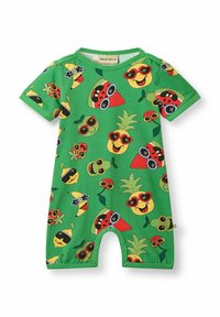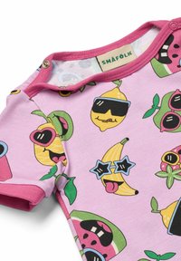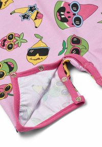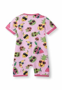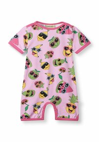 Maluch z kręconymi blond włosami w różowym kombinezonie pokrytym kolorowymi owocami z okularami przeciwsłonecznymi, stojący boso na jednolitym tle.