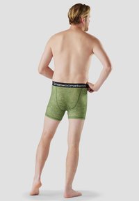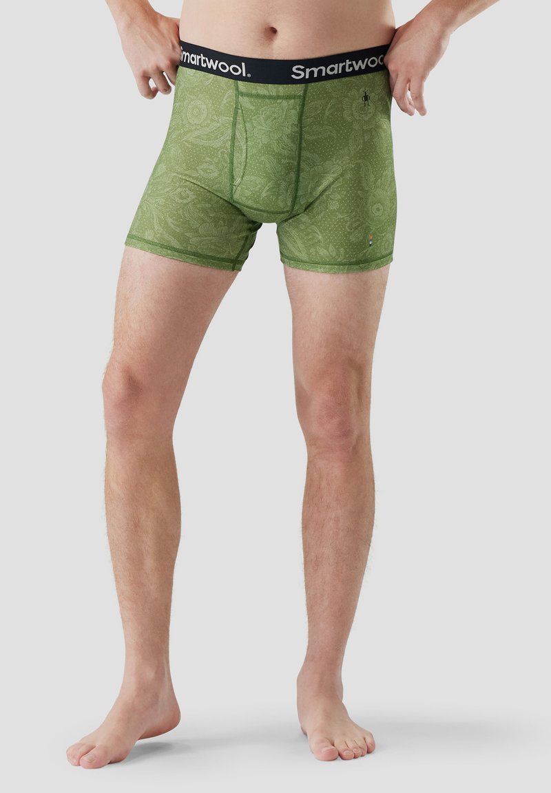 Mężczyzna w zielonych bokserkach w wzory z czarną gumką Smartwool, stojący boso na jednolitym szarym tle.