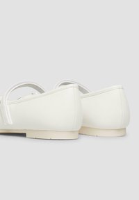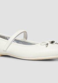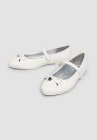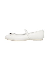 Biała balerina dla dziewczynek z pojedynczym paskiem i małą kokardką na czubku, płaska podeszwa, widok z boku na jednolitym tle.