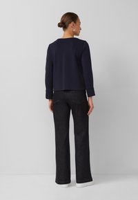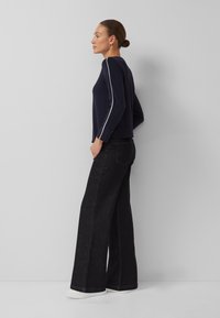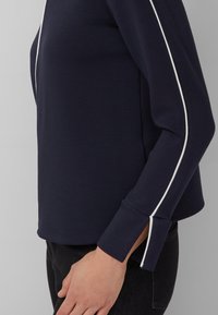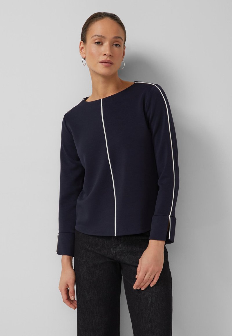 Kobieta ubrana w granatową bluzkę z długim rękawem z białymi przeszyciami na środku i na rękawach, w czarnych spodniach, stoi na tle szarej ściany.