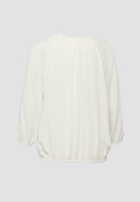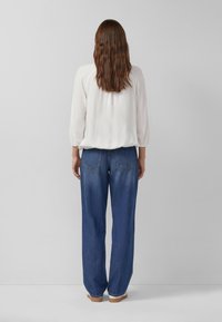 Kobieta o brązowych włosach ubrana w luźną białą bluzkę z długim rękawem i niebieskie dżinsy, patrząca na bok na tle jednolitego szarego tła.