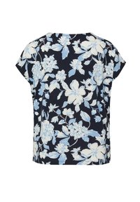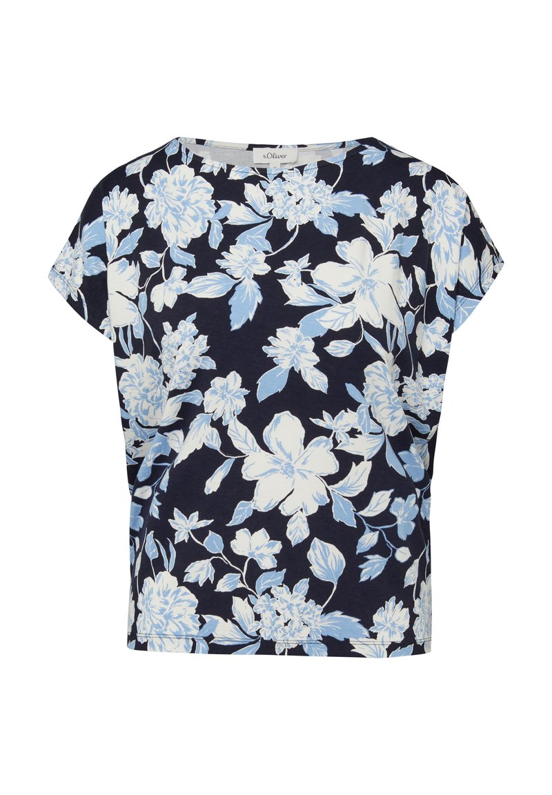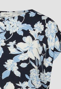 Granatowa bluzka z krótkim rękawem, luźnym krojem oraz wzorem kwiatowym w jasnoniebieskie i białe kolory.