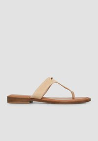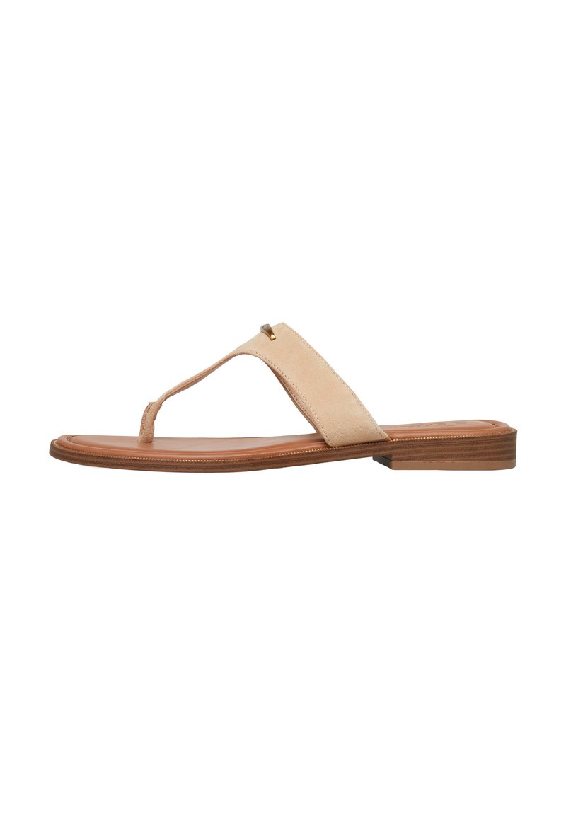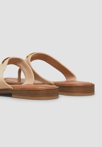 Beżowa skórzana płaska sandałka z szerokim paskiem na podbiciu, paskiem między palcami oraz niskim, drewnianym obcasem.