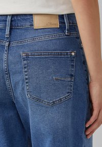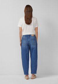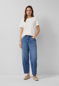 Kobieta stojąca z prawą ręką w kieszeni niebieskich dżinsów, ubraną w białą koszulkę z krótkim rękawem i beżowe trampki na tle szarej ściany.