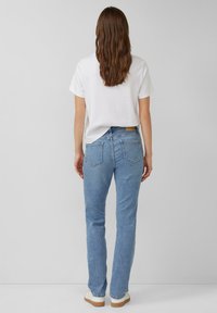 Osoba ubrana w jasnoniebieskie, proste dżinsy z lekkimi przetarciami na lewej udzie, białe trampki i biały top na szarym tle.