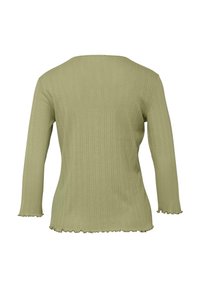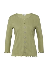Jasnozielony damski kardigan z pionowymi, teksturowanymi paskami, okrągłym dekoltem, siedmioma guzikami z przodu, rękawami 3/4 oraz falbanami na dole i mankietach.