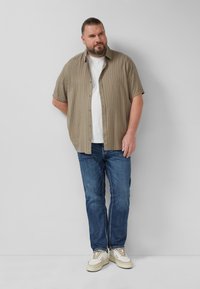 Brodaty mężczyzna z włosami związanymi do tyłu, ubrany w otwartą beżową koszulę z krótkim rękawem na białą koszulkę i niebieskie dżinsy, stoi z rękami w kieszeniach.