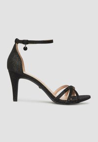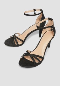 Czarna brokatowa sandałka na wysokim obcasie z paskiem wokół kostki, odkrytymi palcami oraz skrzyżowanymi paskami z przodu, widok z boku na białym tle.