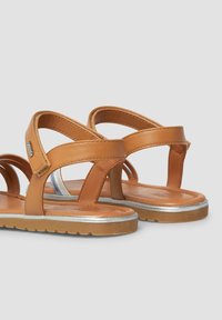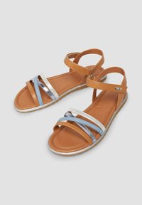 Płaska sandałka z brązowym paskiem wokół kostki oraz trzema paskami z przodu w kolorach srebrnym, niebieskim i metalicznym brązowym, z teksturowaną beżową podeszwą.